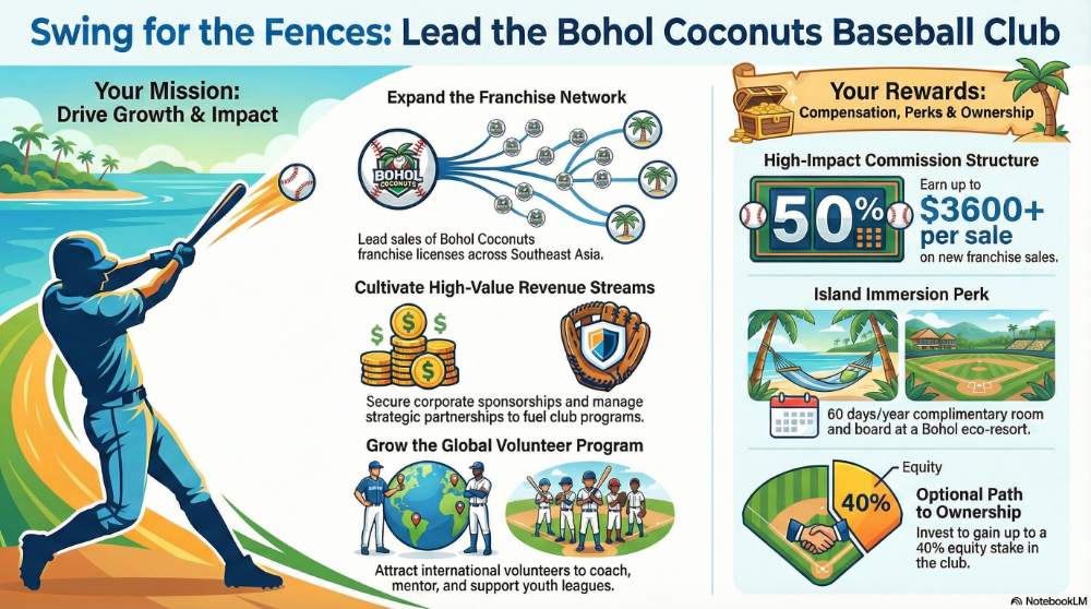 Craft your future: Earn aggressively through commissions, enjoy tropical downtime on Bohol, and optionally own a piece of the club you grow.